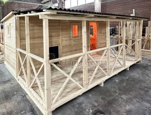Это классическая прямоугольная модель бани с тремя отделениями: предбанником, моечной и парилкой. Для удобства пользования предбанник оснащен лавочкой и вешалкой. В моечной находится лавка и полочка из кедра. Парилка оборудована двухуровневым открытым полком и печью. Время растопки такой бани не превышает 30 минут. На просторной веранде можно оставить вещи или отдохнуть после парения. Каркасно-щитовую баню можно заказать как в готовом, так и в разборном варианте. В разборной модели готовые щиты из кедра быстро собираются в полноценное строение, что также позволяет исключить лишний строительный мусор. Такая баня не требует полноценный фундамент, поэтому при необходимости ее можно перенести в другое место.