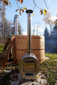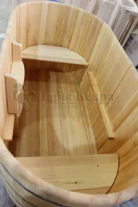 Форма овальной фурако допускает разное расположение сидений, просим Вас при заказе согласовывать свои пожелания с менеджером, так как данный момент влияет на размещение лестницы. В стандартной комплектации лестница идёт по длинной стороне фурако, а форсунки для подачи горячей воды от внешней печи напротив, поэтому сиденья находятся слева и справа. Возможно боковое подключение печи с лестницей у короткой стенки и с сиденьями по длинной стороне фурако. Для круглогодичного использования изделия рекомендуем приобрести дополнительно циркуляционный насос, который ускорит нагревание воды зимой и термокрышку для сохранения тепла длительное время.