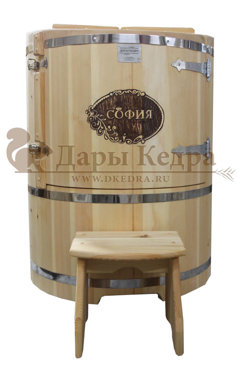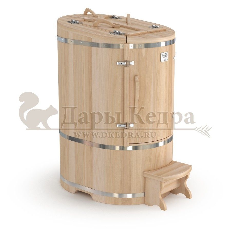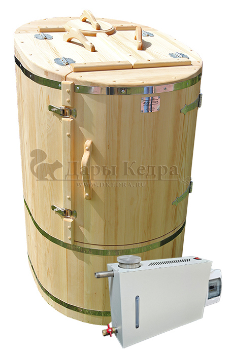 Готовый комплект «Удобный+»: кедровая бочка с парогенератором + био-защита изнутри и снаружи Готовый комплект - это полностью укомплектованный набор с фитобочкой для процедур парения. Овальная модель более просторна и удобна в использовании. Толщина стенок составляет 25 мм. Бочка оборудована откидными створками, дверцей и отверстием для головы. Верхний скос изделия делает положение головы более комфортным и улучшает обзор. Во время парения человек сидит внутри кедровой бочки, а голова находится снаружи. Благодаря этому исключается возможность перегрева. Подлокотники из кедра, встроенные ручки на створках и двери делают эксплуатацию более удобной. Парение в фитобочке благотворно влияет на организм в целом: повышается иммунитет, выводятся шлаки и токсины, улучшается работа органов тела и состояние кожи.