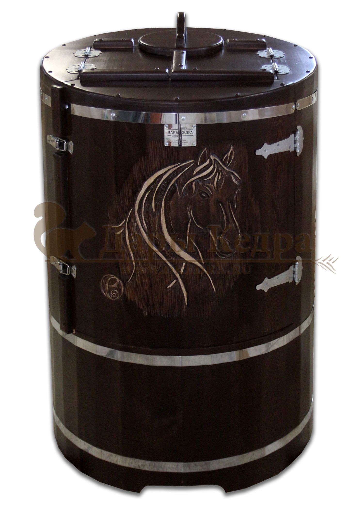 Кедровая бочка (фитобочка) «Фирменная» Это эксклюзивная фитобочка любой модели и комплектации с резьбой вашего логотипа или фирменного знака. Просто приготовьте эскиз рисунка, и наши мастера перенесут его на изделие. Авторский рисунок на фитобочек придаст оригинальность вашему дому или салону красоты, подчеркнёт вашу индивидуальность и непревзойденный вкус. Художественная резьба это ручная работа, выполняется разными мастерами и каждый рисунок неповторим. Вы можете выбрать предложенные варианты резьбы или подобрать изображение и мы предложим вам подходящий эскиз. На сайте представлены наши работы в качестве примера. Каждая резьба рассчитывается индивидуально и может быть нанесена на любую модель фитобочки. Парение в фитобочке благотворно влияет на организм в целом: повышается иммунитет, выводятся шлаки и токсины, улучшается работа органов тела и состояние кожи. Обязательно обращайте внимание на размер дверных проемов вашего помещения. Если они меньше 78 см, то закажите разборную модель!