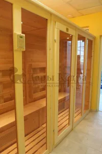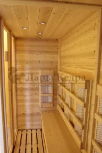 Это специально оборудованная кедровая кабина для прогрева тела человека сухим теплом. Воздух в таких парных не нагревается. Инфракрасные лучи воздействуют на тело, равномерно прогревая мышцы, суставы и органы. Керамические излучатели похожи на лампы, имеют высокую температуру нагрева, поэтому защищены противоожоговыми решетками. Тело человека в таких саунах нагревается интенсивнее. Работает кабина за счет электричества. Вместительная пятиместная инфракрасная сауна с керамическими излучателями подойдет для коммерческого использования.