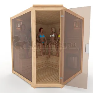 Это специально оборудованная деревянная кабина для сухого и влажного парения. Электропечь нагревает пространство внутри и позволяет сбрызгивать камни водой, слегка увлажняя воздух. Такая процедура позволяет избежать перегрева. Двойные стенки кабины с теплоизоляционным материалом удерживают тепло. Установка сауны в угол позволяет рационально использовать пространство помещения. Финская сауна с электропечью подойдет, как для домашнего использования, так и для коммерции. Доставляется в разборном виде щитами, собирается по инструкции с помощью шуруповёрта.